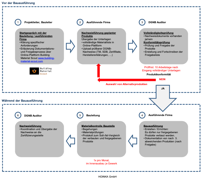 Darüber hinaus müssen alle verwendeten Produkte und Materialien entsprechend den Anforderungen der DGNB, Kriterium PRO 2.2 Qualitätssicherung der Bauausführung, dokumentiert werden: